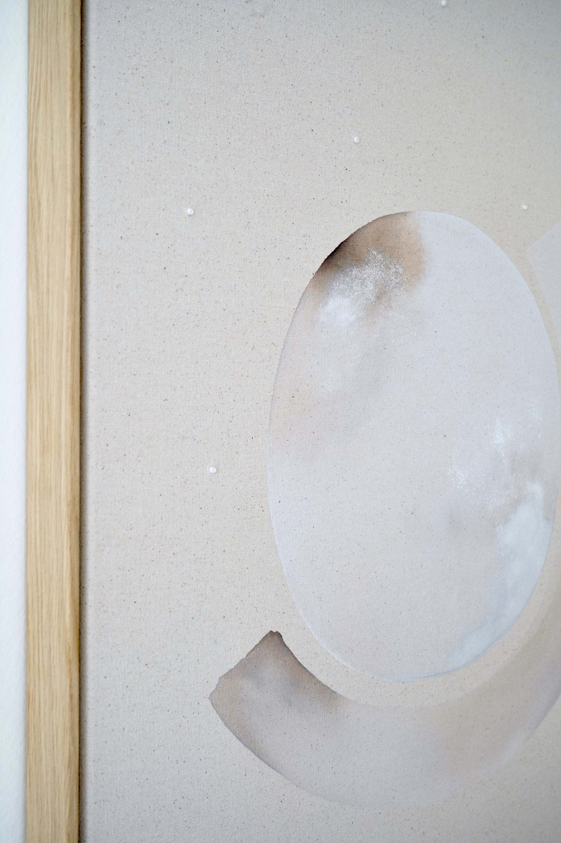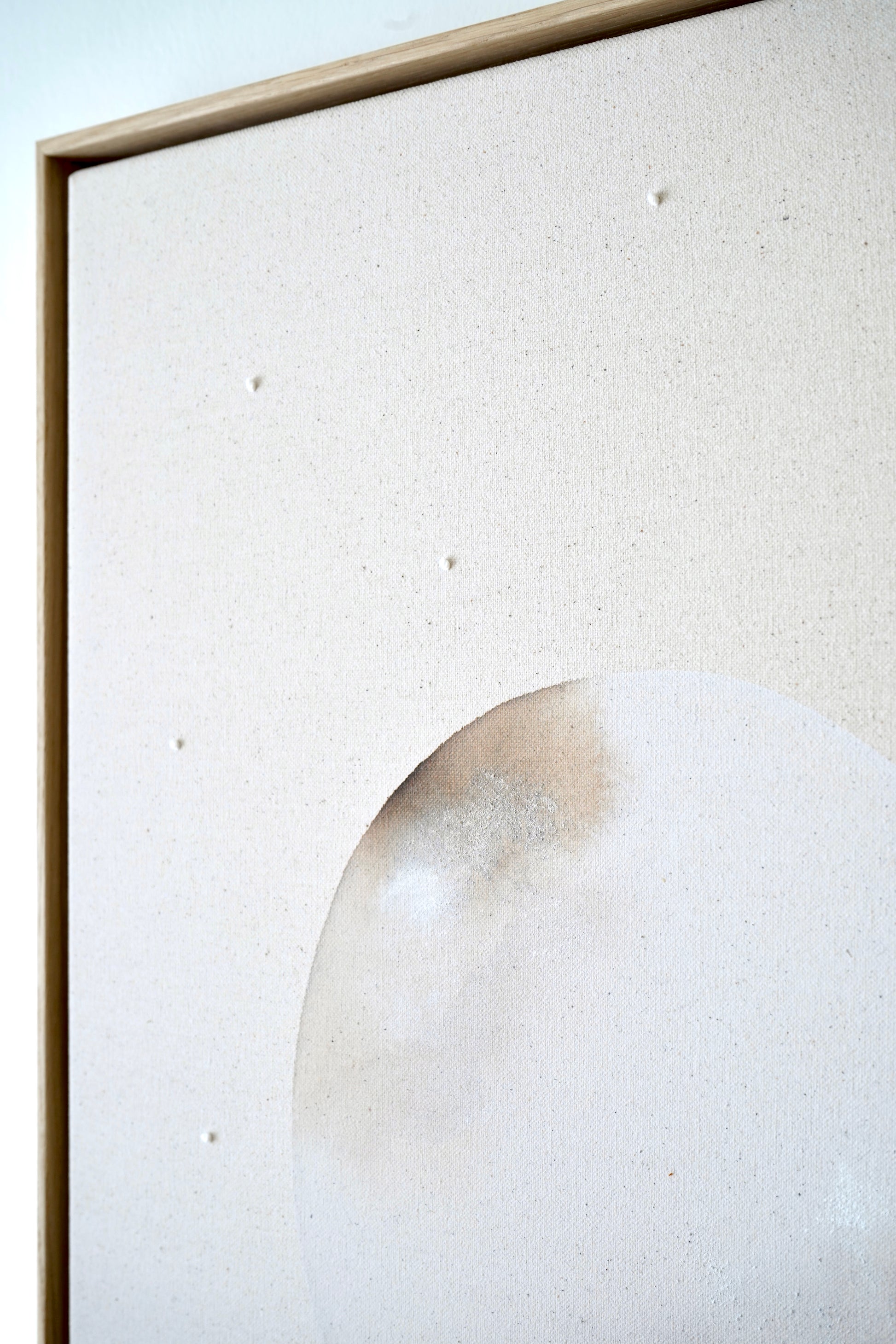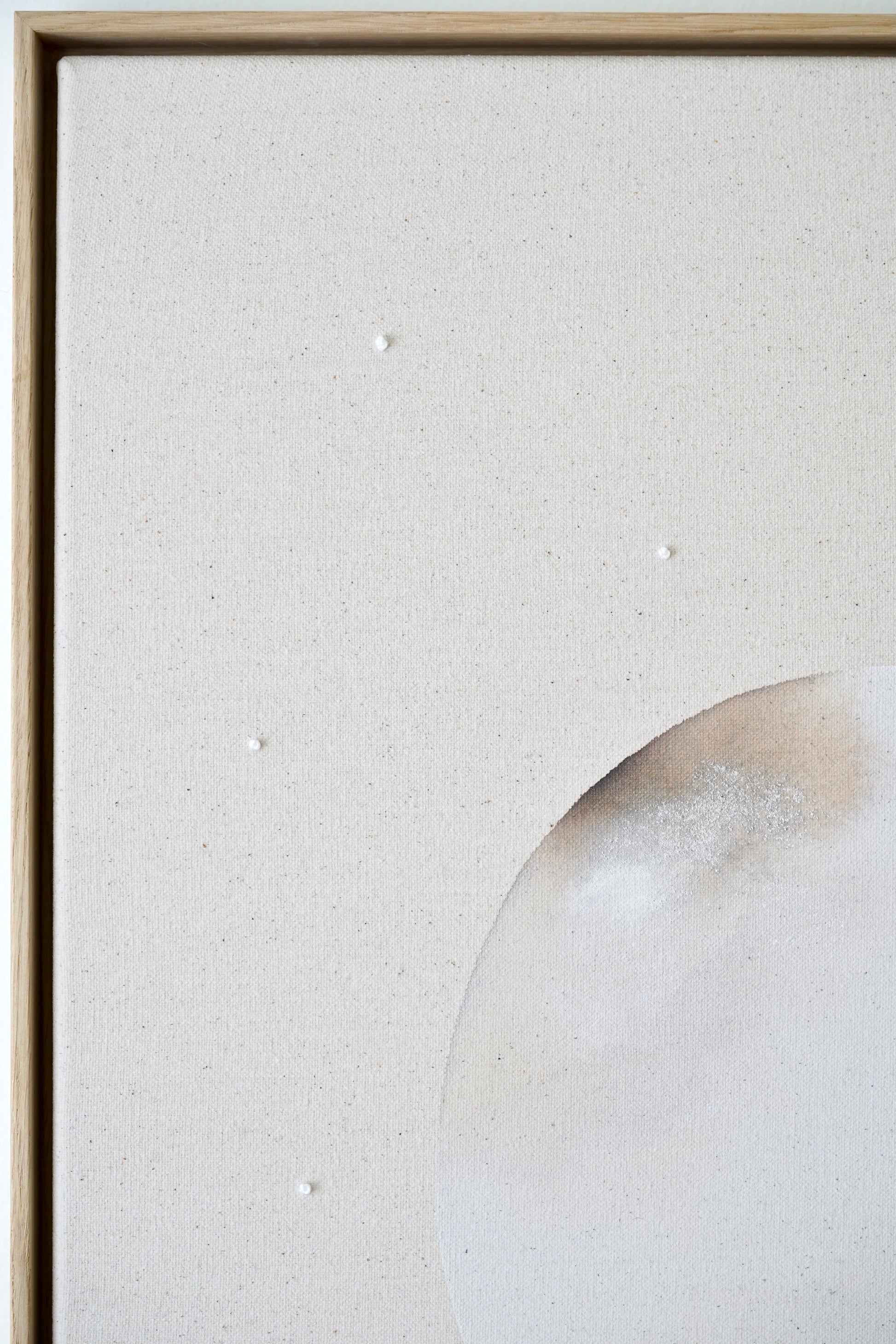 Acrylics and embroidery details on clear-primed raw cotton canvas, framed in oak.